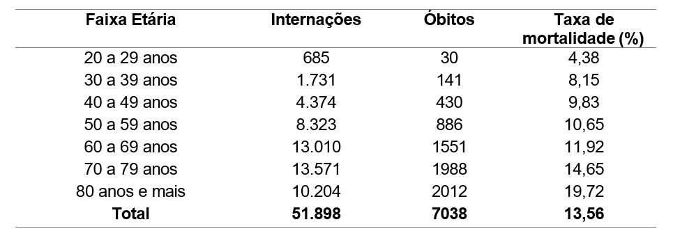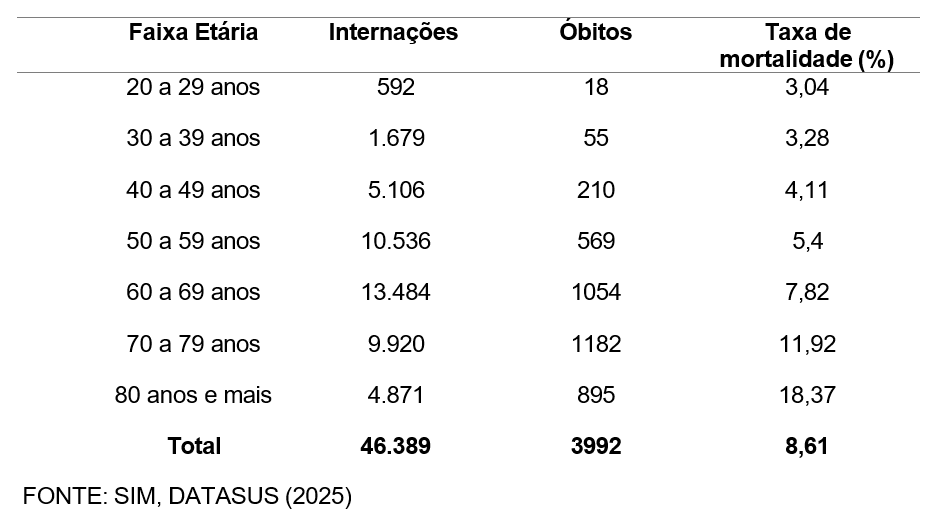 Tabela 2. Número total de internações, óbitos e taxa de mortalidade por Acidente Vascular Cerebral, em Goiás, de 2015 a 2024, conforme a faixa etária, a partir dos 20 anos.