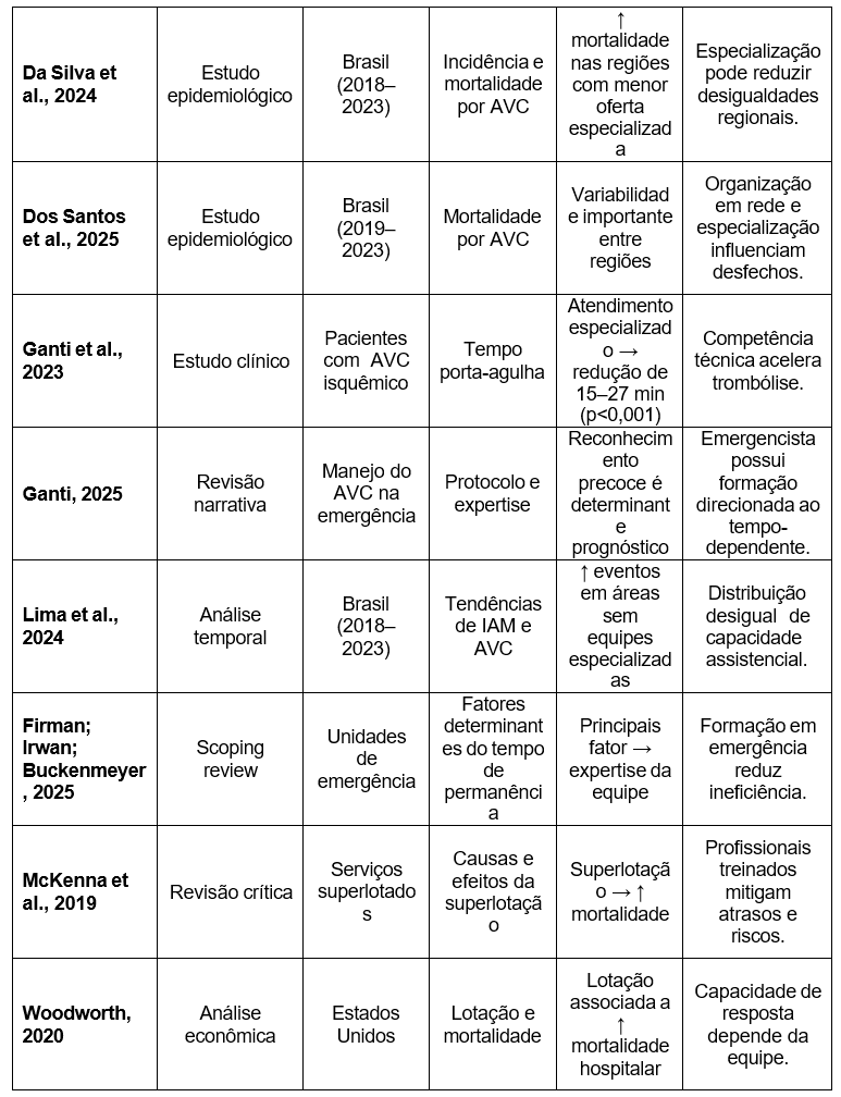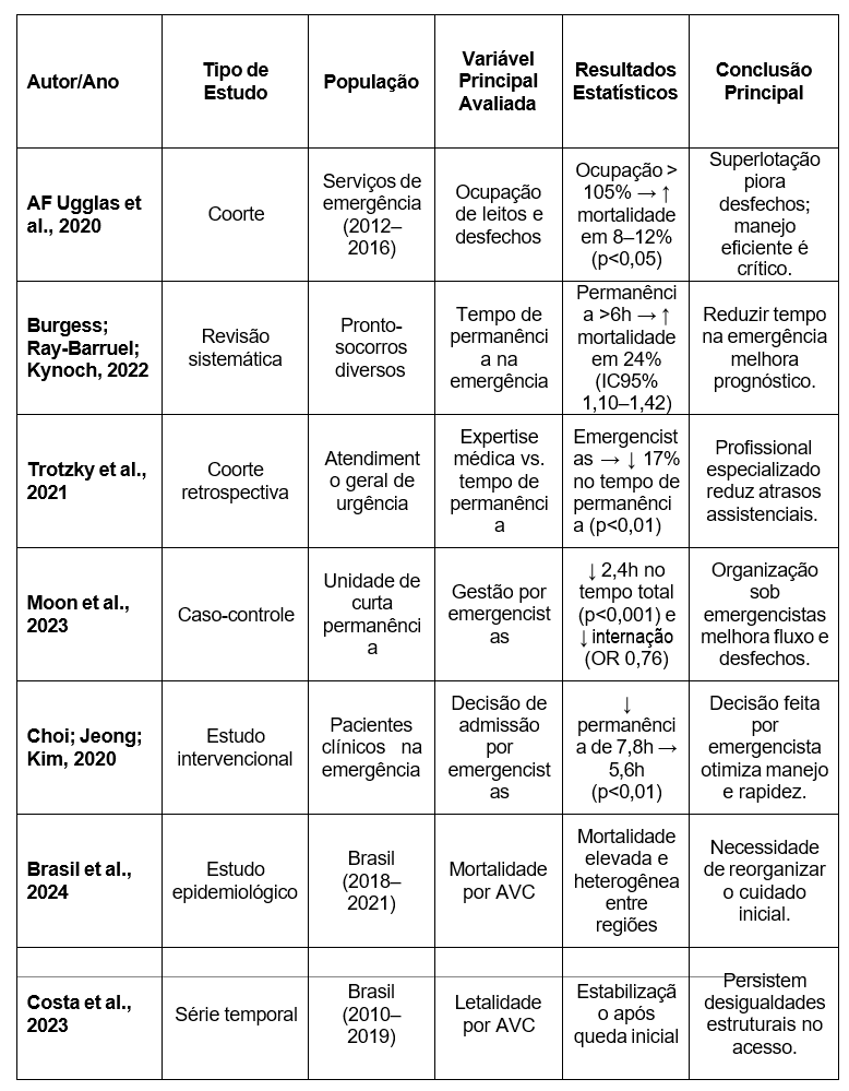 Entre os estudos selecionados, privilegiaram-se coortes multicêntricas, estudos observacionais de grande base populacional, revisões sistemáticas e metanálises, bem como publicações que discutissem o impacto da superlotação, do tempo de permanência no pronto-socorro e da formação do médico emergencista sobre o prognóstico de condições tempo-dependentes. As variáveis extraídas contemplaram: número de eventos cardiovasculares por ano, taxas de mortalidade hospitalar e intra hospitalar em 30 dias, tempos de atendimento crítico (porta-agulha e porta-balão), presença ou ausência de especialista em emergência na equipe responsável, além de indicadores estatísticos apresentados (valores de p, intervalos de confiança, razões de risco e odds ratios).