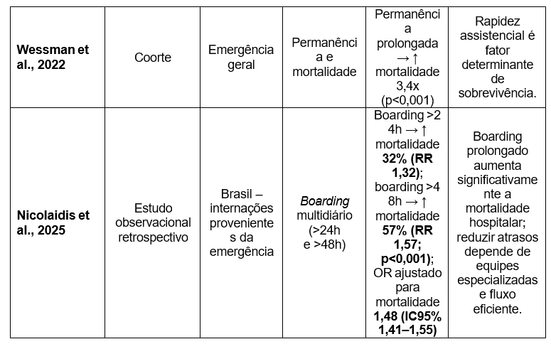Estudos sobre superlotação reforçam que esta constitui determinante independente de mortalidade, sendo que o prolongamento da permanência no pronto-socorro aumenta a mortalidade em até 3,4 vezes em pacientes críticos (p < 0,001). Instituições com equipes emergencistas tendem a apresentar maior agilidade nos processos assistenciais e melhor desempenho em desfechos clínicos (MCKENNA et al., 2019; WOODWORTH, 2020; WESSMAN et al., 2022).