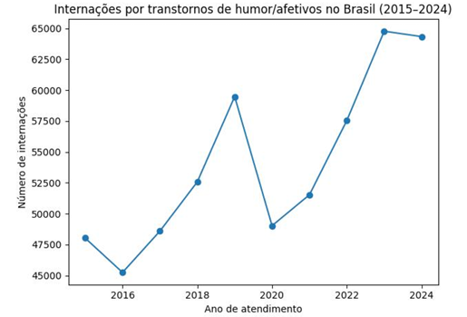 Houve um total de 541.078 internações por transtornos de humor/afetivos no Brasil ao longo do período de 2015 a 2024, revelando uma tendência global de crescimento ao longo da série histórica, apesar de flutuações pontuais. Observa-se que, em 2015, foram registradas 48.021 internações, número que apresentou discreta redução em 2016 (45.239; variação percentual aproximada de −5,8%), seguido de retomada em 2017 (48.587) e crescimento mais consistente a partir de 2018. O pico inicial ocorre em 2019, com 59.473 internações, representando um aumento de cerca de 23,8% em relação a 2015. Esse crescimento progressivo sugere aumento da carga assistencial relacionada aos transtornos de humor no sistema hospitalar brasileiro, possivelmente associado à maior detecção diagnóstica, agravamento dos quadros ou insuficiência de estratégias efetivas de manejo ambulatorial e comunitário.
