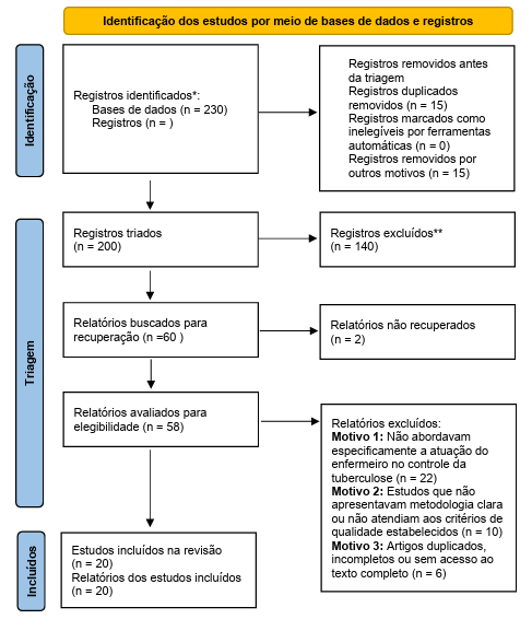 A busca sistematizada identificou inicialmente 230 registros, dos quais 20 estudos (8,7%) atenderam aos critérios de inclusão e compuseram o corpus final desta revisão. As publicações selecionadas distribuíram-se entre os anos de 2020 a 2025, refletindo a produção científica mais recente sobre a atuação da enfermagem no cuidado à tuberculose na AB. Observou-se predominância de estudos nacionais (100%), evidenciando o forte interesse brasileiro em aprimorar estratégias de controle da doença no âmbito do SUS.