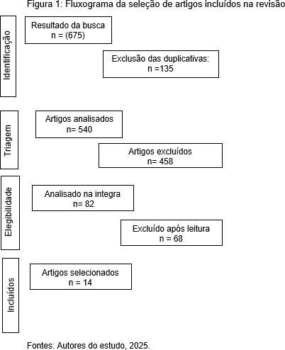 Após a realização da combinação dos descritores nas bases de dados selecionadas para realização desta pesquisa, foram identificados 675 estudos. Desses 135 artigos eram duplicados e foram excluídos. No primeiro momento, foi abordado à leitura dos títulos, resultando na exclusão de 540 trabalhos, por não atenderem os critérios que foram estabelecidos. Na etapa seguinte, foi realizada a leitura dos resumos, o que levou a exclusão de 82 artigos, restando apenas 14 artigos, que foram lidos na íntegra e incluídos na discussão da presente pesquisa. Sendo encontrado na figura 1 o processo de seleção dos artigos.