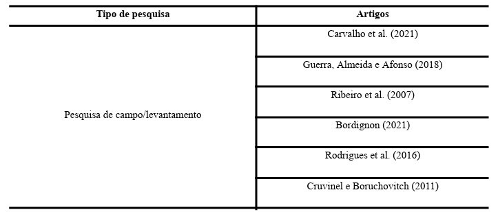 Conforme apresentado no Quadro 1, em relação ao tipo de pesquisa, a maioria dos artigos encontrados (6) são classificados como de campo/levantamento. O único que possui delineamento diferente, refere-se à 1 pesquisa de caráter bibliográfico.