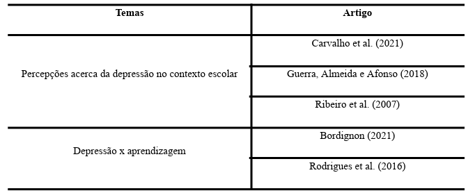 A leitura detalhada dos artigos permitiu a identificação de três temas que caracterizam o interesse das pesquisas brasileiras sobre a depressão infantil no âmbito da educação, como pode ser observado no quadro a seguir.