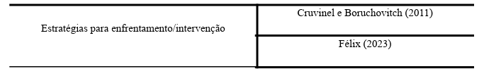 No terceiro tema identificado (Quadro 2), voltado para a discussão de estratégias para enfrentamento/intervenção, os trabalhos (Cruvinel; Boruchovitch, 2011; Félix, 2023) focam as discussões nas estratégias de regulação emocional e na importância de programas de intervenção para desenvolver essa habilidade de regulação a ação do psicólogo no ambiente escolar.