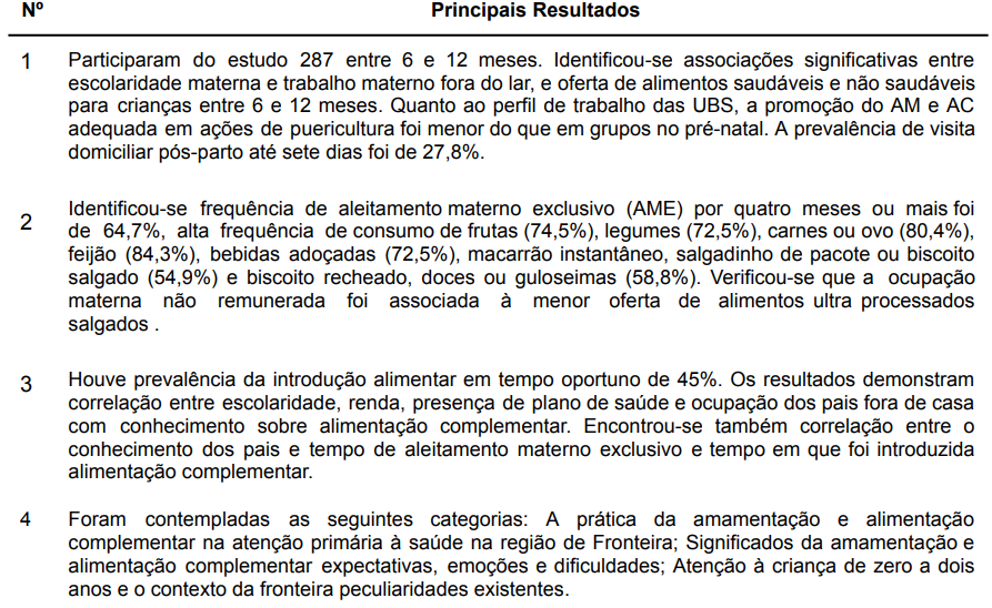 No artigo 2, a ingestão de iogurte ocorreu por 66,7% das crianças avaliadas, sendo assim os ultraprocessados foram associados ao baixo nível de escolaridade materno, foram encontradas associações significativas entre a condição materna de trabalho fora do lar e o maior consumo de embutidos. Em relação ao artigo 4, realizado em Foz do Iguaçu, traz uma abordagem qualitativa mostrando a perspectiva dos profissionais e preconizando suas orientações sobre alimentação complementar e que seja ofertado a todos os grupos alimentares. Nessa pesquisa, uma mãe relata que o profissional de saúde orientou que poderia ser introduzido os alimentos mas que tinha que ter cuidado com os industrializados o açúcar, o sal e o “Danoninho” que muitas mães oferecem.