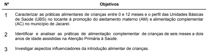 O artigo 1 , traz uma pesquisa realizada no estado de São Paulo na cidade de Jacareí com 290 lactentes com idades entre 6 e 12 meses a qual objetivou identificar as práticas alimentares e a promoção da alimentação complementar. Esse estudo identificou que das crianças estudadas, apresentavam introdução alimentar adequada apenas 24,2% dos participantes com idade entre 6 e 7 meses e 29,6% das crianças de 6 a 9 meses de idade no que tange a frequência alimentar mínima.