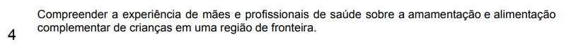 OLIVEIRA, A. R.; BAGGIO, M. A.; FERRARI, R. A. Amamentação e alimentação complementar: experiências de mães e profissionais de saúde em região de fronteira. Enfermagem em Foco, v. 12, n. 6, 2022.