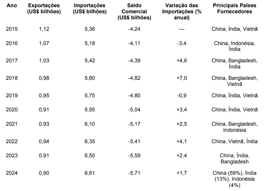 Nesse sentido, a seguir, a Tabela 1 apresenta um panorama sintético dos resultados observados entre 2015 e 2024, com base em fontes oficiais como a Associação Brasileira da Indústria Têxtil e de Confecção (ABIT), o Ministério do Desenvolvimento, Indústria, Comércio e Serviços (MDIC) e organismos internacionais, como a UNCTAD.