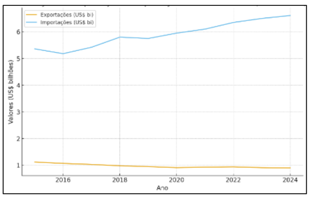A partir dos dados apresentados na Tabela 1, torna-se relevante visualizar de forma comparativa a evolução das exportações e importações têxteis ao longo do período analisado. A representação gráfica a seguir permite observar com maior clareza a tendência de estagnação das exportações em contraste com o avanço contínuo das importações, especialmente a partir de 2018. Essa diferença crescente entre os dois fluxos evidencia, de maneira visual e objetiva, o aprofundamento do desequilíbrio comercial do setor, reforçando a perda de competitividade da indústria nacional frente aos produtos asiáticos de baixo custo. Assim, o gráfico contribui para a compreensão dinâmica do comportamento da balança comercial têxtil brasileira, facilitando a análise das tendências estruturais discutidas na sequência.