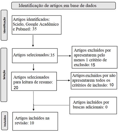 encontrado um total de 35 artigos, onde foi feita uma triagem com a leitura de títulos e resumos, sendo 15 excluídos por não abordarem a temática propriamente ou por não possuir rigor científico, resultando em 20 artigos que foram selecionados para leitura de resumo. Desses, 10 foram excluídos por não apresentarem todos os critérios de inclusão e 10 foram analisados na íntegra e considerados úteis para composição desta revisão sistemática.