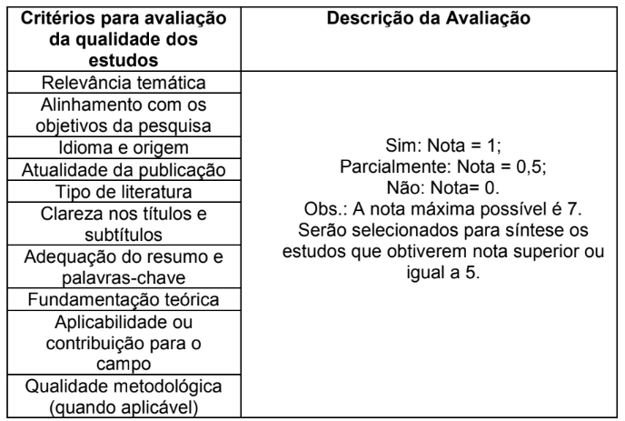 O quadro 05, os estudos foram analisados de acordo com nove critérios de qualidade, sendo atribuídas notas conforme o seguinte sistema: Sim (1 ponto): quando o critério foi plenamente atendido; Parcialmente (0,5 ponto): quando atendido de forma incompleta ou indireta; Não (0 ponto): quando o critério não foi atendido. A pontuação máxima possível por estudo foi 7, sendo incluídos na síntese final apenas aqueles que obtiveram nota superior ou igual a 5, conforme estabelecido.
