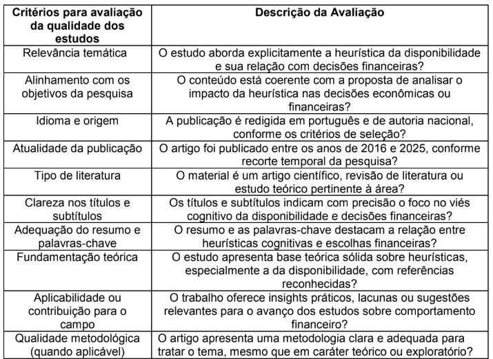 A partir dos critérios estabelecidos no Quadro 04, foi possível realizar uma análise qualitativa estruturada dos estudos selecionados, permitindo avaliar com maior precisão o grau de contribuição de cada publicação para a compreensão do impacto da heurística da disponibilidade nas decisões financeiras.