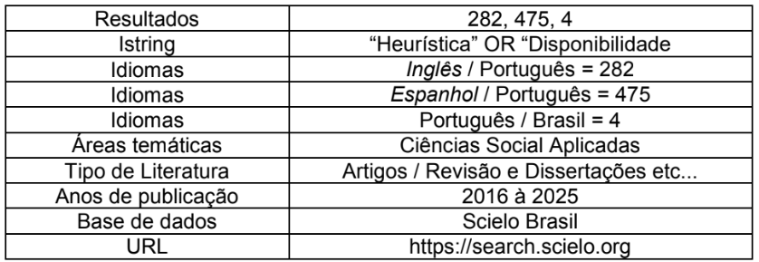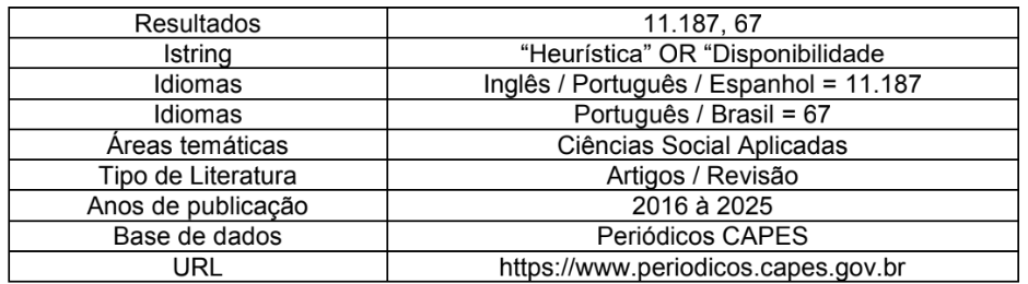 A pesquisa bibliográfica realizada na base de dados Periódicos CAPES permitiu identificar um total de 11.187 publicações associadas aos termos “Heurística” ou “Disponibilidade”, considerando os idiomas inglês, português e espanhol no período de 2016 a 2025.