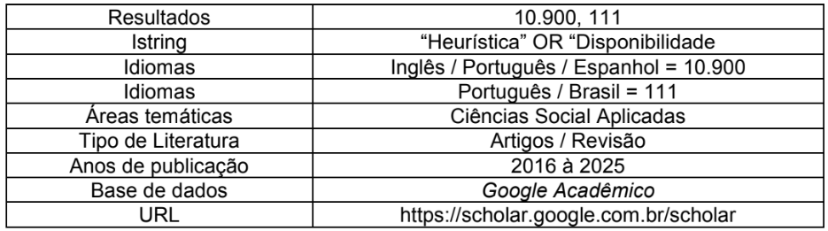 O quadro 02, a busca realizada na base Google Acadêmico, conforme os critérios definidos no protocolo da pesquisa, resultou em um total de 10.900 documentos relacionados à string de busca “Heurística” OR “Disponibilidade”, abrangendo os idiomas inglês, português e espanhol.