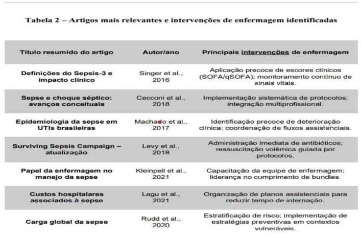 A análise qualitativa destacou ainda um conjunto de artigos considerados centrais para a compreensão do papel da enfermagem na prevenção da progressão da sepse. Esses trabalhos foram selecionados por sua relevância metodológica e impacto na prática clínica, oferecendo subsídios concretos para a definição de estratégias assistenciais. A Tabela 2 apresenta tais estudos, resumindo título, autores e as principais intervenções de enfermagem identificadas (Singer et al., 2016; Kleinpell et al., 2021).