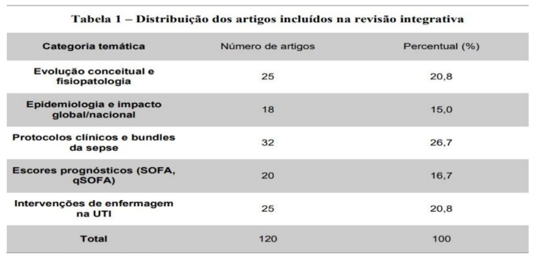 A busca sistematizada nas bases de dados resultou na identificação de 1.280 estudos, dos quais 120 foram incluídos após aplicação dos critérios de elegibilidade. Os artigos selecionados contemplam aspectos relacionados à evolução conceitual da sepse, sua epidemiologia, protocolos clínicos, escores prognósticos e intervenções específicas da enfermagem em Unidades de Terapia Intensiva. Essa diversidade permitiu uma análise transversal e crítica da literatura (Whittemore; Knafl, 2005).