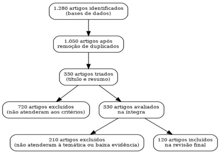 O processo de seleção seguiu as recomendações do PRISMA (Preferred Reporting Items for Systematic Reviews and Meta-Analyses), que estabelece diretrizes para transparência e reprodutibilidade em revisões sistemáticas. Inicialmente foram identificados 1.280 estudos; após a remoção de duplicatas, restaram 1.050. Na triagem por títulos e resumos, 720 foram excluídos por não atenderem aos critérios. A leitura completa foi realizada em 330 artigos, dos quais 210 foram excluídos por não apresentarem evidências suficientes ou não contemplarem a temática da enfermagem. A amostra final resultou em 120 estudos elegíveis para análise qualitativa.