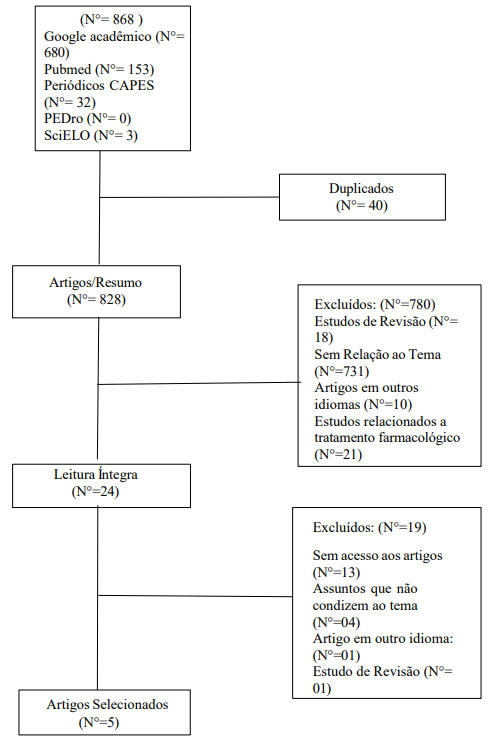 Os critérios de exclusão foram: estudos publicados anteriormente a 2014, artigos em diferentes idiomas do inglês e português, artigos que envolvessem tratamento farmacológico e artigos duplicados.