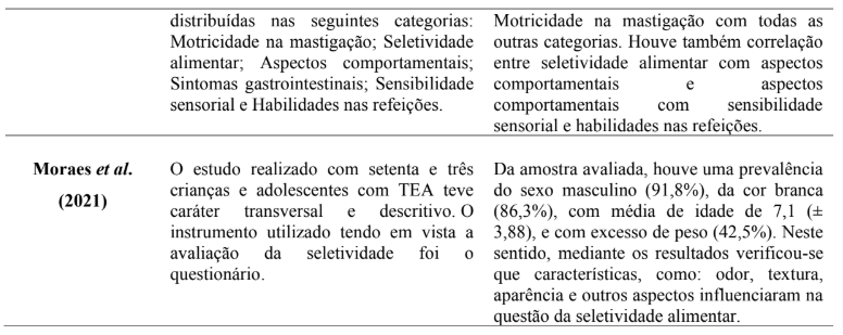 MORAES, L. S.; et al. A. Seletividade alimentar em crianças e adolescente com transtorno do espectro autista. Revista da Associação Brasileira de Nutrição – RASBRAN, v. 12, n. 2, p. 42-58, 2021.