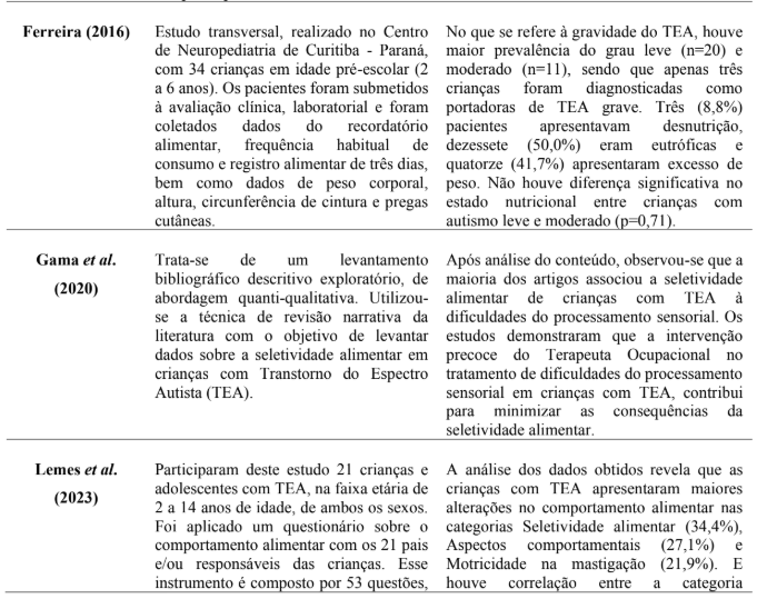 Tabela 1: Estudos que retratam sobre o papel da nutrição na seletividade alimentar de crianças com Transtorno do Espectro Autista (TEA).