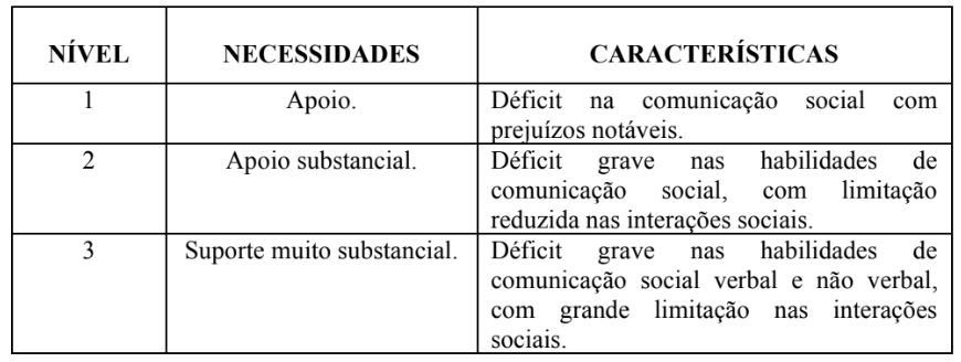 De acordo com Martins et al. (2020) pode-se inferir que acerca dos níveis de suporte (gravidade) do TEA, eles correspondem aos graus de suporte 1 onde o autista precisa de pouco suporte em razão de ser esta, a condição mais leve.