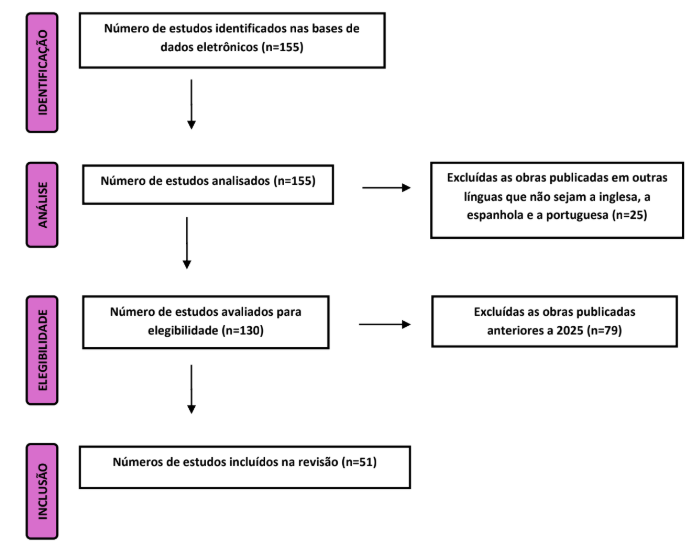 Após a coleta dos dados foi realizada a seleção do material, através dos critérios de elegibilidade que consistiram na escolha de artigos e obras publicadas no período de 2015 a 2024 (exceto as fontes oriundas de autores clássicos e documentos oficiais); material publicado nas línguas portuguesa, espanhola e inglesa; produções e publicações que tratavam, especificamente, sobre o tema e obras oriundas de fontes fidedignas e confiáveis. No que se refere aos critérios de inelegibilidade consistiram na seleção de todos os materiais produzidos e publicados em outras línguas que não fossem a portuguesa, a espanhola e a inglesa, obras e artigos publicados anteriores a 2015, obras que não tratavam acerca do tema e materiais produzidos e publicados em fontes não confiáveis.