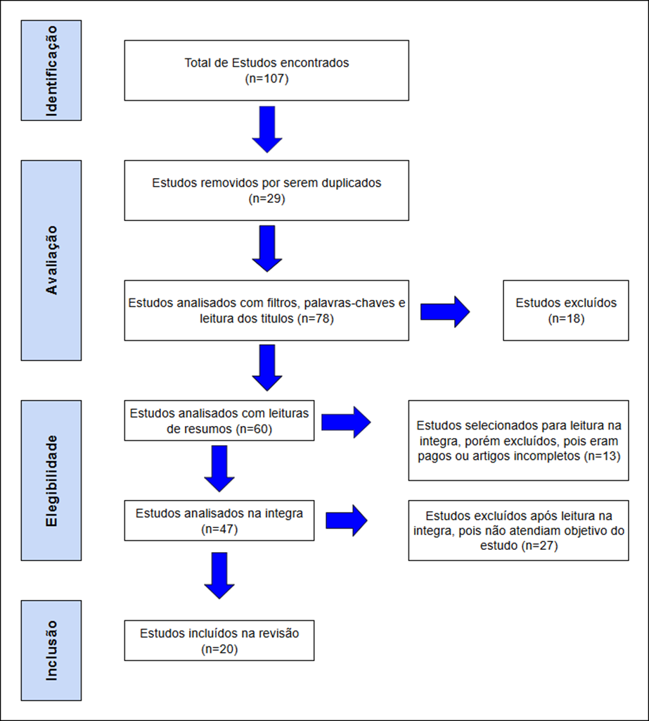 Foram encontrados um total de 107 artigos, após remoção dos duplicados (n = 29) resultaram 78 artigos que compuseram o corpus de análise. A Figura 1 apresenta as etapas de cada processo em consonância ao modelo PRISMA (2009) resultando em 20 artigos.