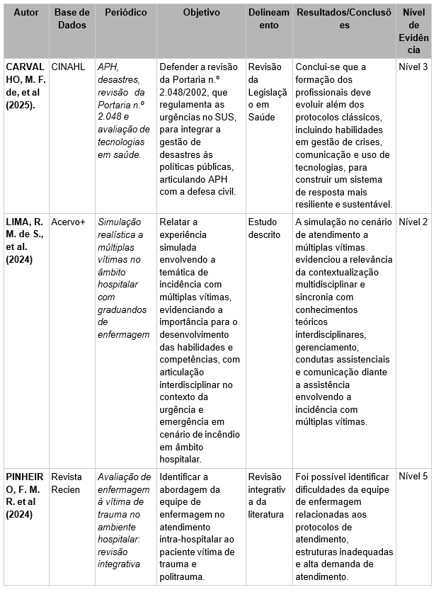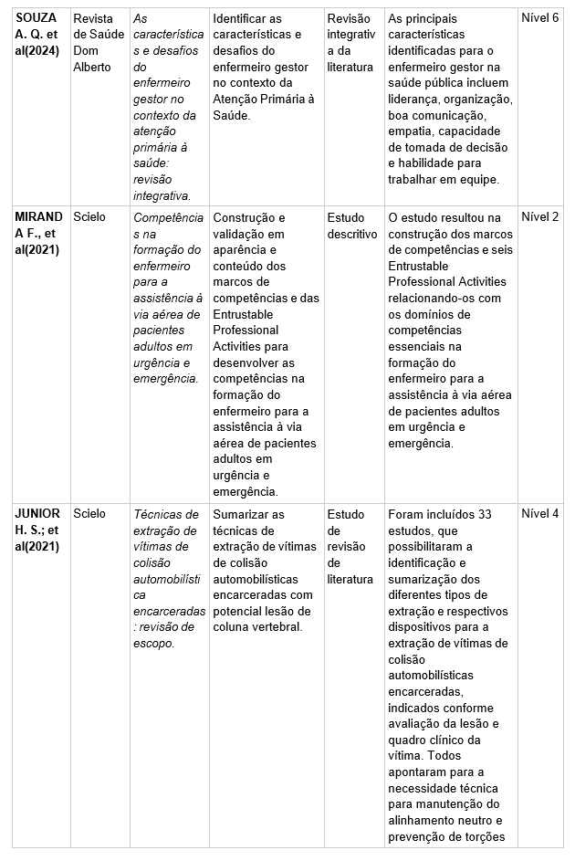 A análise aprofundada dos estudos selecionados permitiu identificar quatro eixos temáticos centrais que sintetizam as evidências sobre a atuação do enfermeiro no Atendimento Pré-Hospitalar (APH). Inicialmente, ressalta-se seu papel de liderança na equipe, com ênfase na tomada de decisão rápida e na garantia da segurança do paciente no cenário extra-hospitalar. Contudo, evidencia-se uma contradição crucial: a prática demonstra a indispensabilidade desse profissional, mas os estudos apontam para lacunas na formação acadêmica, que é frequentemente insuficiente em treinamentos específicos para urgência e emergência.