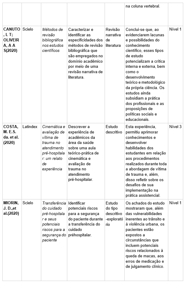 JUNIOR, H S; et al Técnicas de extração de vítimas de colisão automobilística encarceradas: revisão de escopo. Rev Esc Enferm USP. 2021 ;55:e20210064. https://doi.org/10.1590/1980-220X-REEUSP-2021-0064 – Acesso em: 13 out. 2025.