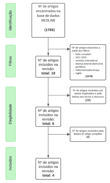 Métodos: Realizou-se uma revisão integrativa da literatura na base de dados MEDLINE/PubMed. Foram selecionados artigos em inglês no período de 2021 a 2025, utilizando como descritores “doença arterial obstrutiva periférica” e “índice tornozelo-braço”.