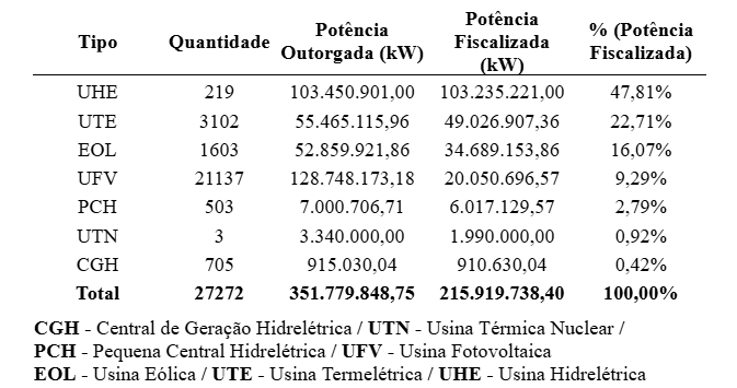 Tabela 1– Matriz de Geração Elétrica Brasileira em dezembro de 2025