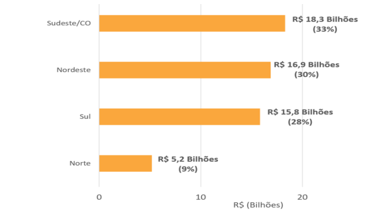 O investimento total será distribuído entre as regiões geoelétricas, conforme Figura 3, sendo, R$ 30,6 bilhões (54%) referentes a investimentos em obras com o propósito de escoamento de geração, ao passo que R$ 25,6 bilhões (46%) são relativos a obras planejadas com foco no atendimento aos mercados regionais.
