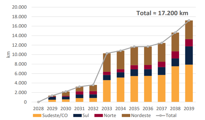 O estudo prevê, conforme a Figura 4, a construção de cerca de 17.200 km em novas linhas de transmissão no período do PET/PELP (2026 a 2039). As maiores expansões serão na região sudeste/centro-oeste, seguido da região nordeste, sobretudo, a partir do ano de 2033.