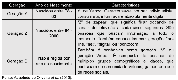 Segundo Oliveira et al. (2019), essa geração de jovens já nasceu e cresceu em um mundo cercado de tecnologia e, devido à influência da cultura digital, costuma ser chamada de Geração C, ou é a geração V, definido de geração virtual. Esta geração inclui pessoas associadas ao perfil que caracteriza este grupo. Não pertence necessariamente a uma data ou período específico conforme mostra o Quadro 1.