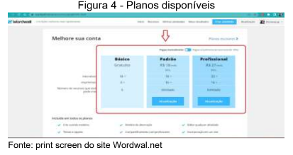 A seguir, na página, serão exibidos os planos e seus respectivos benefícios, conforme mostrado na Figura 4. Na versão gratuita, você pode criar até 5 atividades interativas usando 18 modelos de jogos, que podem ser editados a qualquer momento.