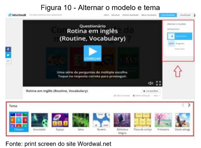 A plataforma Wordwall oferece uma vantagem significativa ao permitir que os professores alterem facilmente o modelo de jogo após criar uma atividade. Isso pode ser feito com apenas um clique em “Alterna o modelo” localizado na lateral direita da página de atividade. Nessa opção, são apresentadas as melhores opções de modelos para o formato de jogo. Além disso, na maioria dos modelos, também é possível alterar os temas que modificam a aparência do modelo, incluindo gráficos, imagens e fontes de sons. Essas opções estão disponíveis abaixo da atividade, como ilustrado na Figura 10.