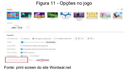 Logo após as opções de temas, é possível encontrar diferentes opções, dependendo do modelo de jogo, para definir o cronômetro e configurar o jogo. Após realizar as alterações desejadas, basta clicar em “Aplicar a esta atividade” para salvar as modificações efetuadas, como exemplificado na figura 11.