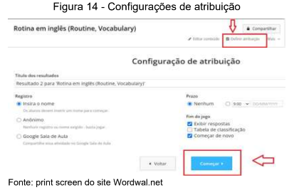3. Conforme ilustrado na Figura 14, o usuário pode configurar as atribuições de acordo com suas necessidades e, em seguida, clicar em “Começar”. Entre as opções sugeridas, é possível indicar ou não ao aluno o prazo final para realização da atividade. Além disso, a plataforma permite liberar a pontuação e o gabarito da atividade para o aluno poder analisar os erros e acertos cometidos, podendo reforçar o assunto proposto jogando novamente.