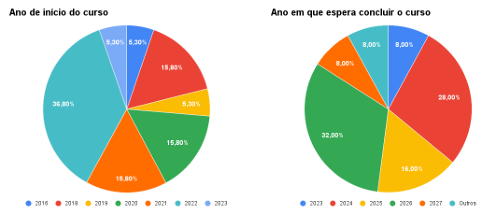 A Figura 8 representa uma perspectiva dos alunos considerados na análise. Nela, observamos que a maioria, equivalente a 36,8%, matriculou-se no ano de 2022. Além disso, mais da metade dos entrevistados manifestou a expectativa de concluir o curso entre os anos de 2024 e 2026.