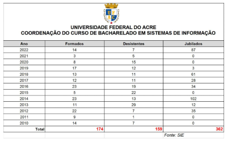 Com base em informações obtidas diretamente da Coordenação do Curso de Sistemas de Informação, é evidente uma elevada taxa de desistência e uma baixa taxa de formação de profissionais durante o período de 2010 a 2022. Nesse intervalo de tempo, foram registradas 159 desistências e 362 jubilamentos, enquanto apenas 174 estudantes conseguiram concluir o curso.
