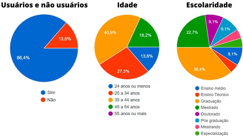 A Figura 1, representa os seguintes dados já analisados. Começando por quem usa e quem não usa plataformas digitais, cerca de 86,4% dos respondentes usam e 13,6% não usam. Com relação à idade, 40,9% tem entre 35 e 44 anos, 27,3% têm entre 25 e 34 anos e nenhum usuário com mais de 55 anos. Relacionado a escolaridade temos os seguintes dados, 36,4% são graduados, 22,7% tem mestrado, 9,1% ou tem doutorado, ou pós-graduação, ou ensino médio, por último temos 4,5% com especialização ou ensino médio, ou realizando o mestrado.