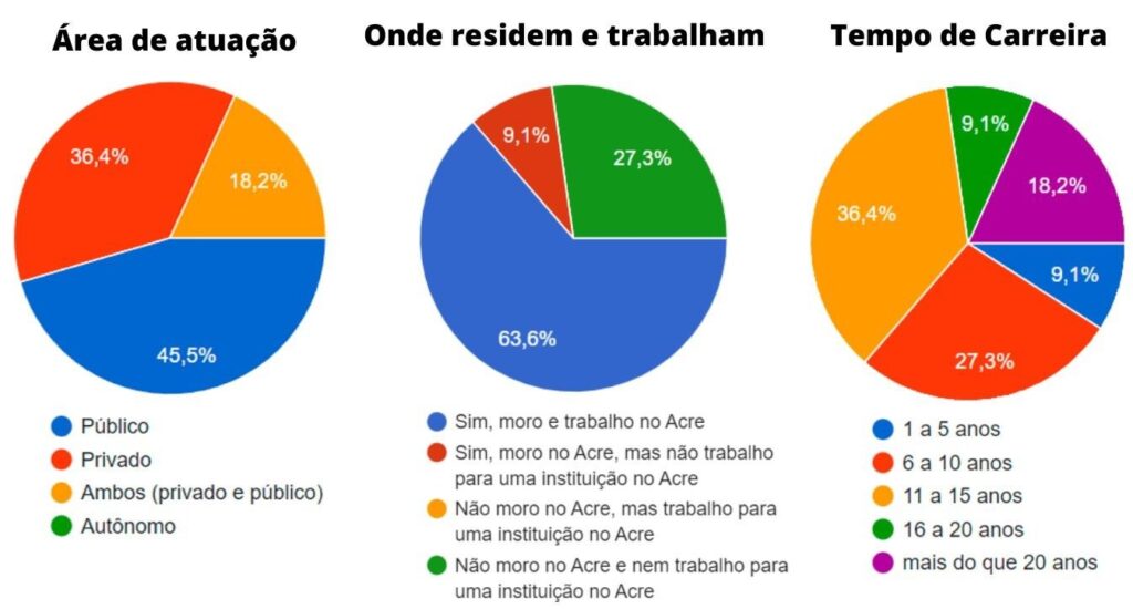 A Figura 2, apresenta os dados de uso geral: quanto a área de atuação, 45,5% trabalham no setor público, 36,4% trabalham no setor privado, 18,2% trabalham nos dois setores e nenhum participante é autônomo. Em relação à carreira, temos que 63,6% trabalham e moram no Acre, 27,3% não moram e nem trabalham no Acre e 9,1% moram no Acre, mas não trabalham para uma instituição sediada no estado. Por último o tempo de carreira, 36,4% têm de 11 a 15 anos de carreira, 27,3% tem de 6 a 10 anos de carreira, 18,2% têm mais de 20 anos de carreira, sendo que 9,1% possuem de 1 a 5 anos ou 16 a 20 anos.