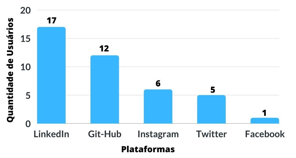 Todos os que responderam com idade entre 18 anos a 44 anos possui no mínimo uma rede social curricular, tendo apenas 4 participantes dos quais acreditam que obtiveram muita visibilidade, 5 que não tiveram nenhuma diferença na visibilidade, 5 que obtiveram apenas um pouco e outros 5 obtiveram uma razoável visibilidade com a criação dos perfis. Na Figura 3, temos que 12 participantes tem GitHub, 17 participantes tem LinkedIn, 5 tem Twitter, 6 possuem Instagram e apenas 1 usa o Facebook.