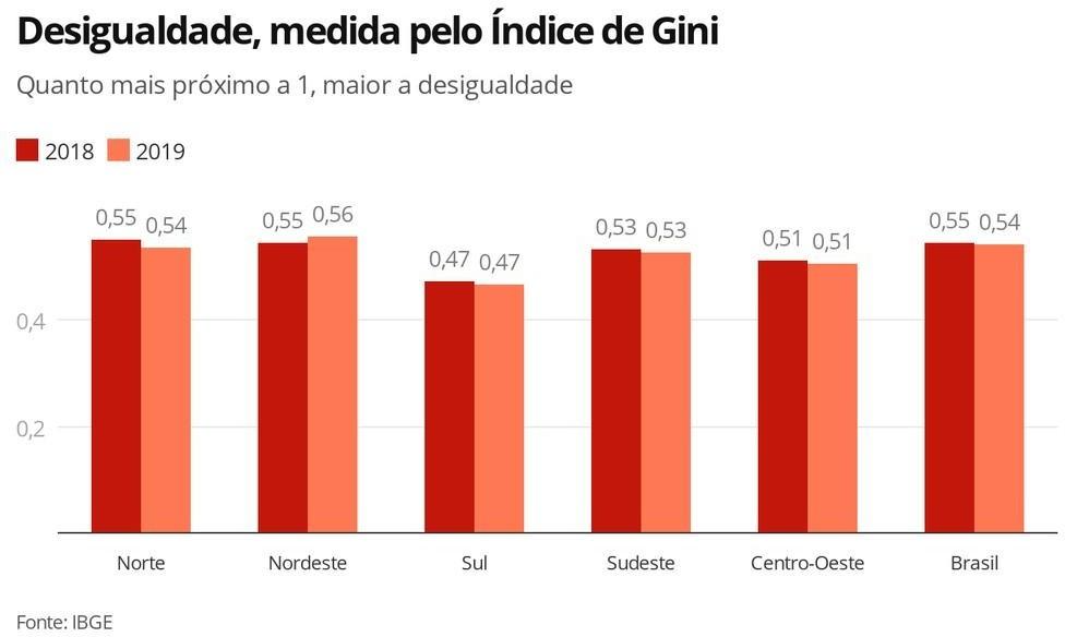 De acordo com o IBGE – Instituto Brasileiro de Geografia e Estatística, a concentração de renda aumentou em 2018 no país. Os dados mostram que o rendimento mensal dos 1% mais ricos do país é quase 34 vezes maior do que o rendimento da metade mais pobre da população. Ainda, o estudo mostrou que a renda dos 5% mais pobres caiu em 3%, enquanto a renda dos 1% mais ricos aumentou em 8%. Assim, o Índice de Gini – instrumento utilizado para medir a desigualdade no Brasil – voltou a subir. No ano de 2018, alcançou o número de 0,509, o índice varia de zero a um, quanto mais próximo de um, pior é a distribuição de renda no país. Dados atuais afirmam que a taxa de desemprego está em aproximadamente 12,3%, o que afeta 12,6 milhões de pessoas.