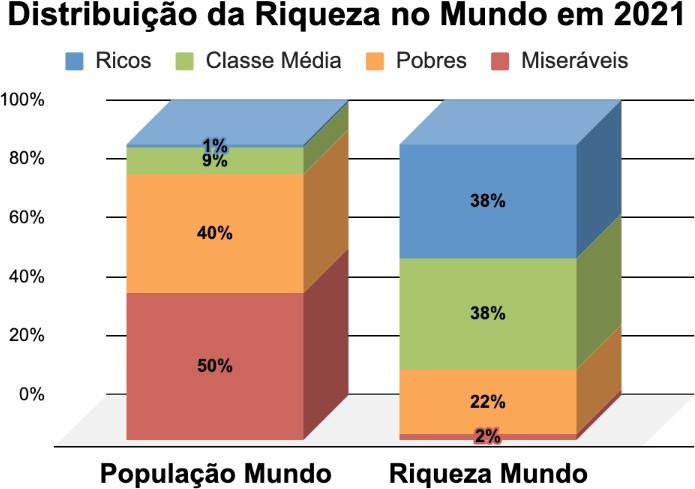 No gráfico acima, o top 1% mais rico do mundo, 79 milhões de pessoas, possui 38% da riqueza humana, 177,7 Trilhões de dólares. Isso corresponde a US$ 2,2 Milhões de patrimônio acumulado por pessoa rica. Os 9% a seguir, a classe média, 711 milhões de pessoas, possuem uma outra fatia de 38% da riqueza produzida pela humanidade. Isso corresponde mais precisamente a 175,8 Trilhões de dólares. Uma média de US$ 247.236 per capita. Os 40% abaixo, as pessoas pobres, uma população de 3,2 Bilhões, possuem 22% da riqueza, 101,7 Trilhões de dólares. Isso corresponde a US$ 32.186 por pessoa. Já os 50% de baixo, os miseráveis do mundo, são 4 Bilhões de seres humanos. Eles possuem 1,8% do estoque de riqueza mundial, 8,3 Trilhões de dólares. Por pessoa isso corresponde a US$ 2.112, o preço de uma moto usada. Portanto, o gráfico evidencia a extrema concentração de riqueza no mundo, em que uma pequena parcela da população concentra quase a totalidade dos recursos globais, enquanto bilhões de pessoas sobrevivem com valores irrisórios. Esse contraste reforça a urgência da implementação de políticas redistributivas e de justiça social, em consonância com os objetivos da Agenda 2030 da ONU, a fim de promover uma sociedade mais equilibrada, inclusiva e sustentável.