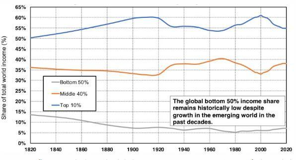 A parcela da renda global que vai para os 10% mais rico em nível mundial flutuou em torno de 50-60% entre 1820 e 2020 (50% em 1820, 60% em 1910, 56% em 1980, 61% em 2000, 55% em 2020), enquanto a parcela que vai para os 50% mais pobre geralmente tem sido em torno ou abaixo de 10% (14% em 1920, 7% em 1910, 5% em 1980, 6% em 2000, 7% em 2020). A desigualdade global sempre foi muito grande. Ele cresceu entre 1820 e 1910 e mostra pouca tendência de redução a longo prazo entre 1910 e 2020.
