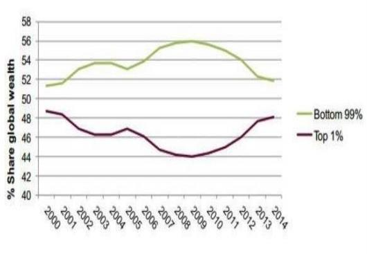 Figura 1: Share of global wealth of the top 1% and bottom 99% respectively Fonte: Credit Suisse data available 2000-2014. Acesso em: 03/10/2023.