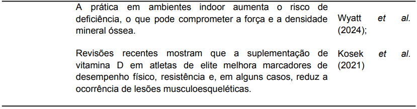 WYATT, P. B.; et al. Vitamin D supplementation in elite athletes: a systematic review. Orthopaedic Journal of Sports Medicine, v.12, n.2, 2024. DOI: https://journals.sagepub.com/doi/full/10.1177/23259671231220371.