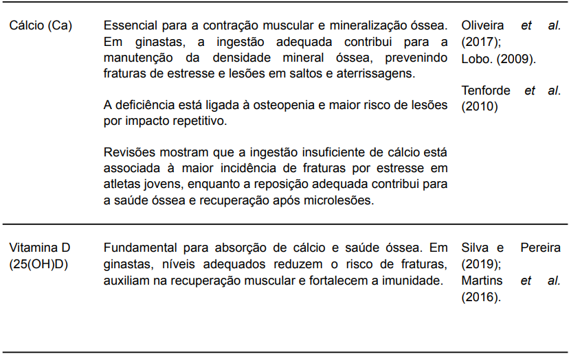 O cálcio (Ca), por sua vez, é um micronutriente essencial tanto para a contração muscular quanto para a mineralização óssea, desempenhando papel estrutural e funcional no organismo. De acordo com Oliveira et al. (2017), em ginastas, cuja rotina envolve saltos, aterrissagens e impactos repetitivos, a ingestão adequada desse mineral contribui significativamente para a manutenção da densidade mineral óssea e para a prevenção de fraturas por estresse. De forma semelhante, Lobo (2009) destaca que a deficiência de cálcio está associada ao desenvolvimento de osteopenia e ao aumento do risco de micro lesões em atletas submetidos a treinos de alta intensidade.